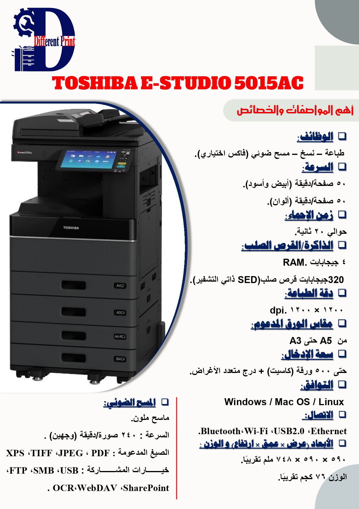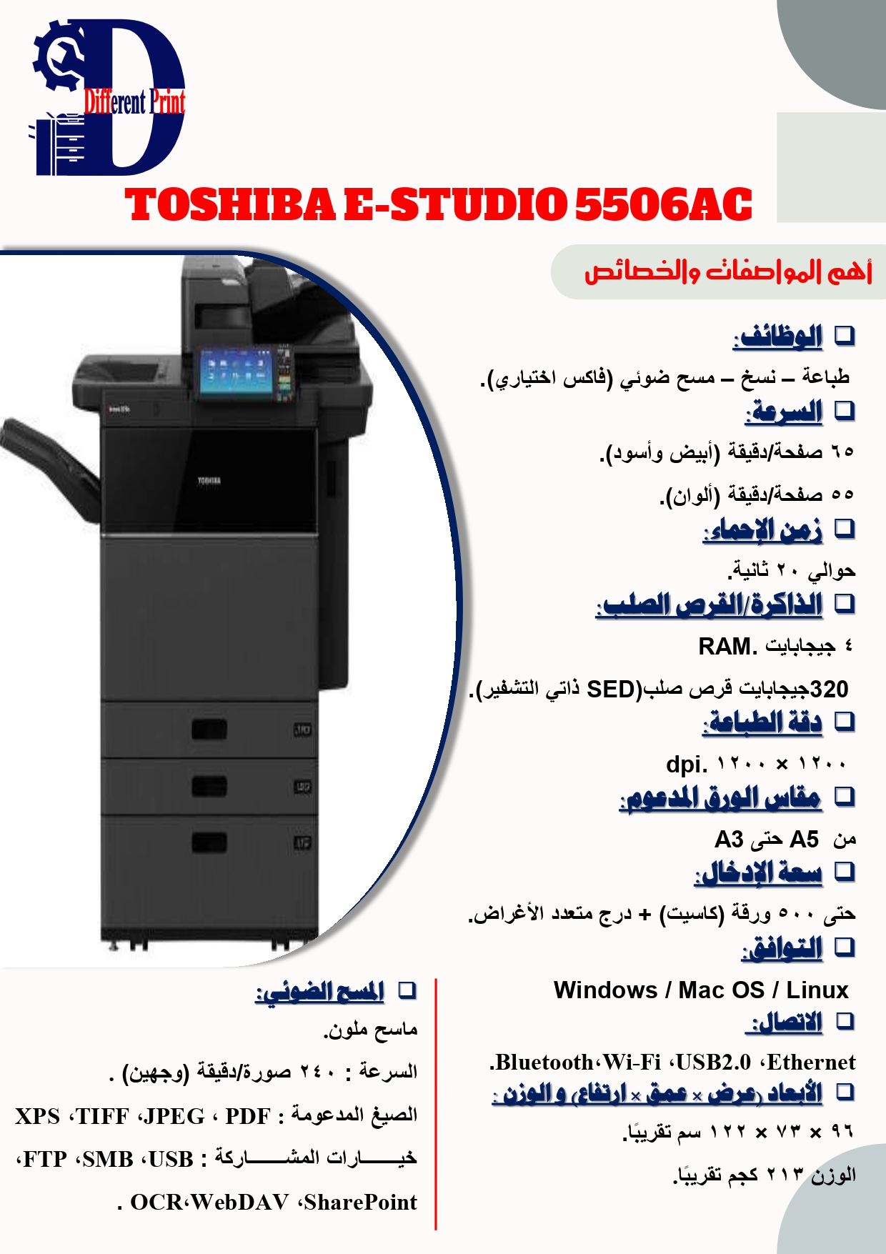 تعد جهاًزا متطوًرا ومتعدد الوظائف، مصمًما لتلبية احتياجات المكاتب العصرية التي تتطلب جودة ألوان استثنائية ومرونة عالية. توفر هذه الماكينة طباعة، نسخ، مسح ضوئي (مع خيار الفاكس) بسرعة مختلفة ( 25 – 30 – 35 – 45 – 50 – 55 – 65 ) صفحة في الدقيقة لكال اللونين الأبيض و الأسود و الألوان